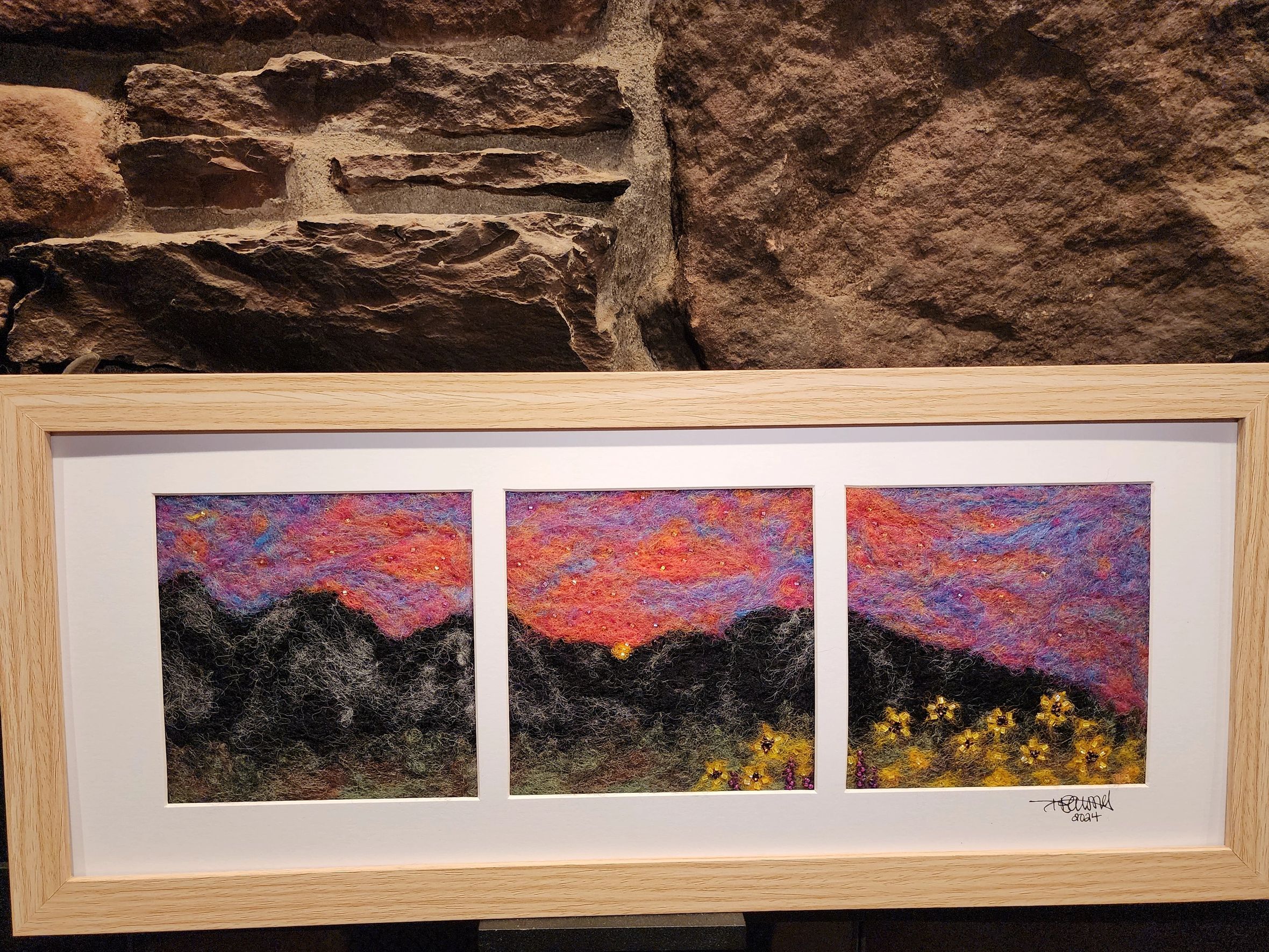 This hand-felted triptych captures the fleeting beauty of twilight as it blankets a mountain range in hues of rose, lavender, and deep indigo. The dark silhouettes of rugged peaks contrast against a glowing sky, dotted with stars and a golden sun descending into dusk. In the foreground, wildflowers bloom defiantly—bright yellows and subtle purples offering a grounding burst of life.