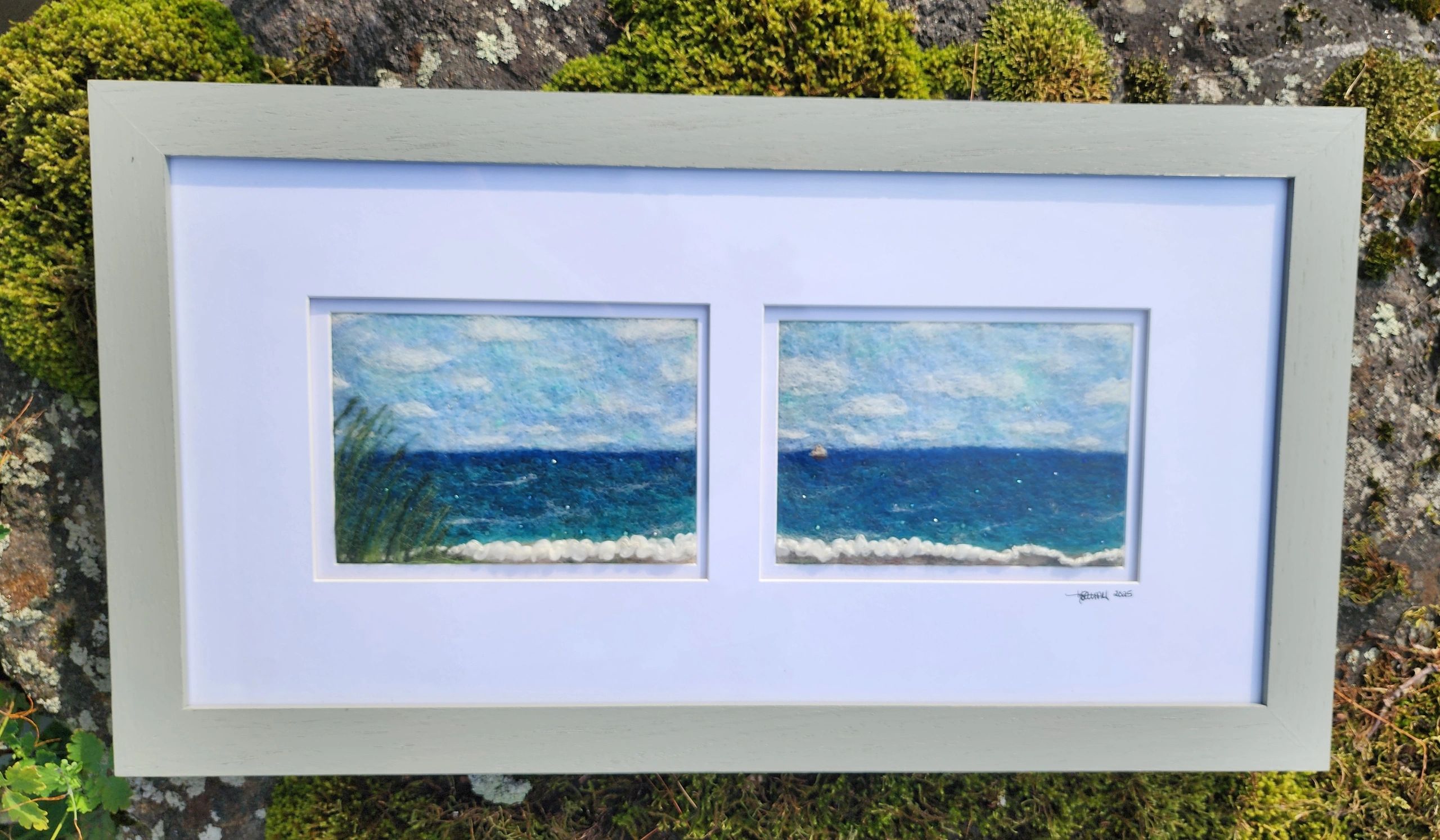 This diptych captures the serene rhythm of the ocean through a tactile interplay of fiber and beads. Each panel invites the viewer to experience the shifting hues of the sea and sky—the deep blues of distant waters, the frothy white of breaking waves, and the soft gradient of clouds above.