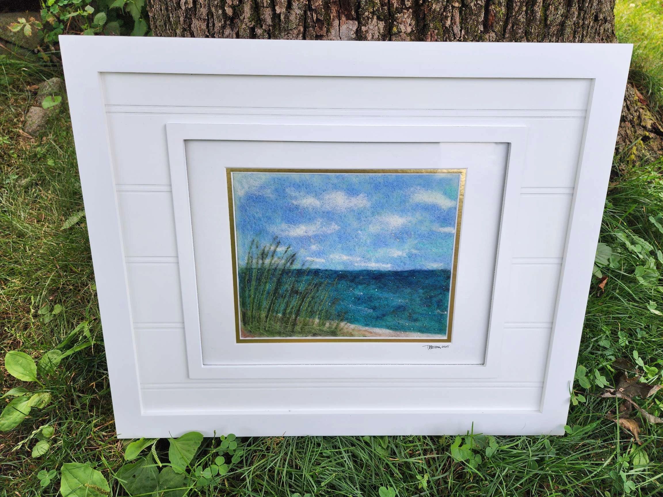 This intimate coastal landscape draws the viewer into a textured world where land, sea, and sky meet in quiet harmony. The use of fiber adds a tactile quality, allowing the viewer to not only see but almost feel the breeze that moves through the scene. A quiet, contemplative piece, "Whispers of the Sea" captures the fleeting serenity of standing at the water’s edge, grounded in the moment yet carried away by the endless expanse of sky and ocean.