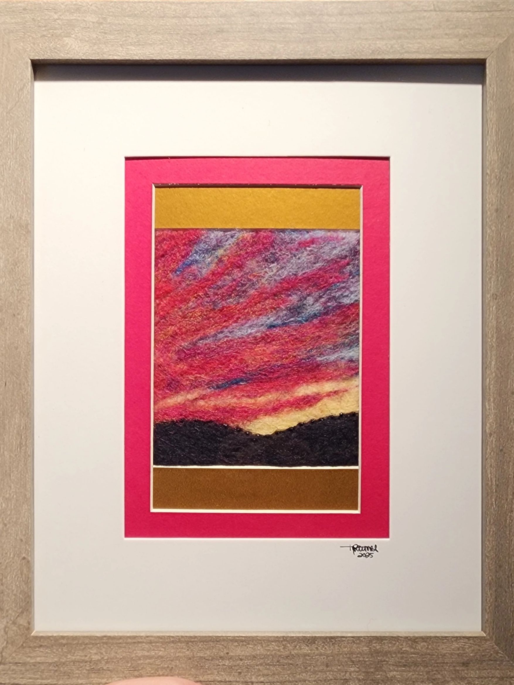 A breathtaking fiber landscape capturing the quiet drama of twilight. Layers of hand-felted wool in crimson, violet, and gold sweep across the sky like brushstrokes of fire, fading gently into the dark silhouette of distant hills. The scene evokes that fleeting moment when the sun dips below the horizon, leaving behind a glow that seems to set the whole world alight—warm, peaceful, and full of wonder.