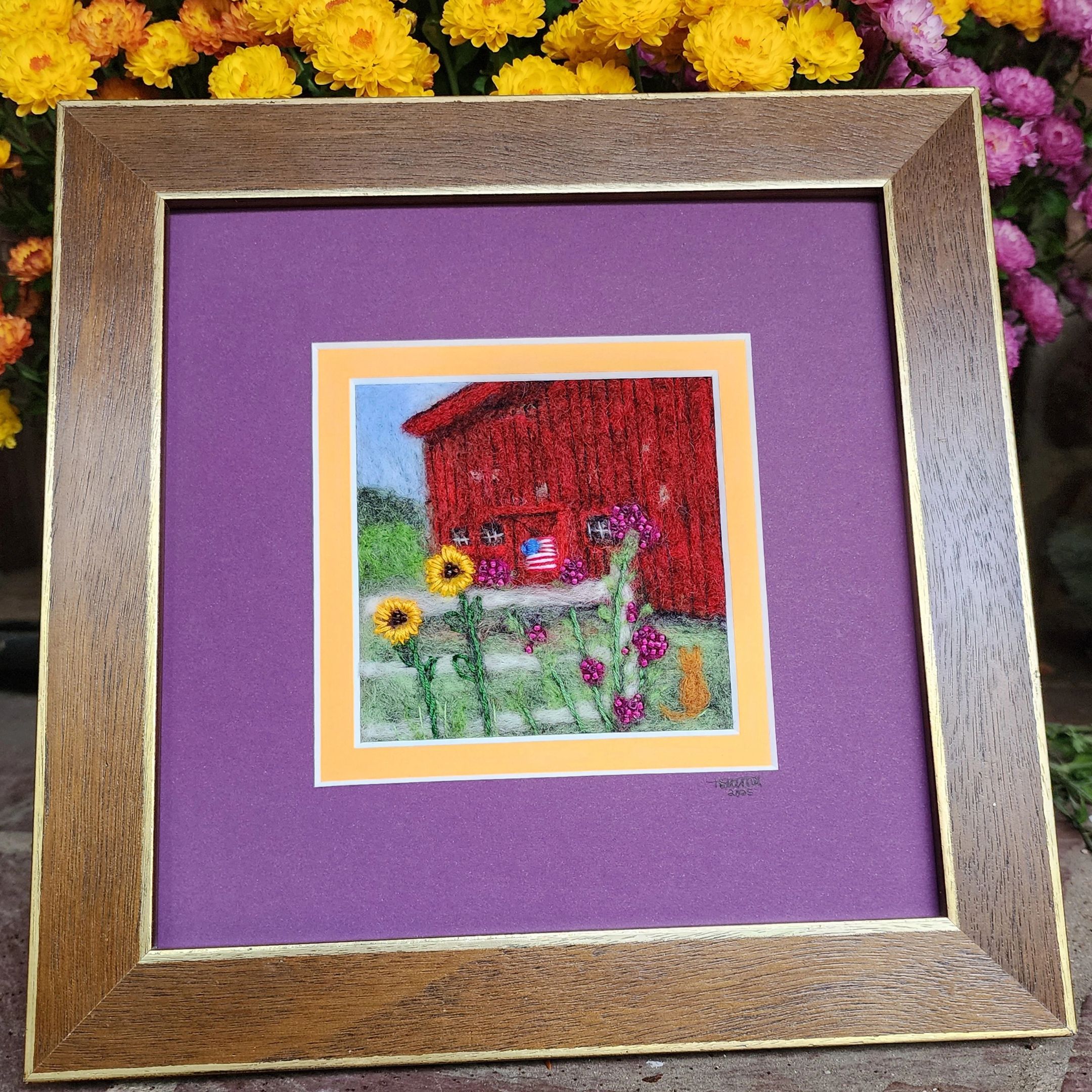 Basking in the golden quiet of a North Granby summer, Summer at Lost Acres captures the warmth and tranquility of orchard life — where time seems to slow beneath wide skies and weathered barns. Each strand of fiber is placed freehand, blending texture and light to evoke the scent of apple trees, blooming sunflowers, and colorful garden beds. A heartfelt tribute to one of my favorite local places.