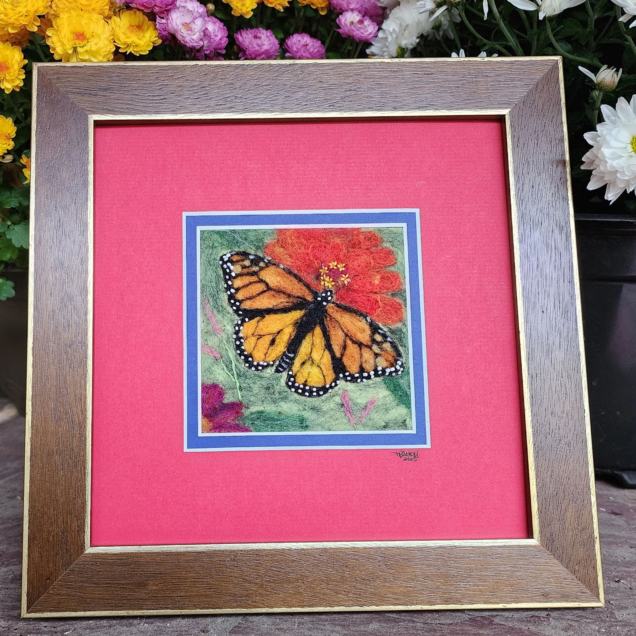 A celebration of nature’s fleeting beauty — the monarch’s delicate wings dancing above a sea of radiant zinnias. Hand-felted entirely freehand with wool and accented with shimmering glass beads, this piece captures the quiet magic of late summer when color and life are at their peak. Every stitch and fiber honors the grace and resilience of these beloved pollinators.